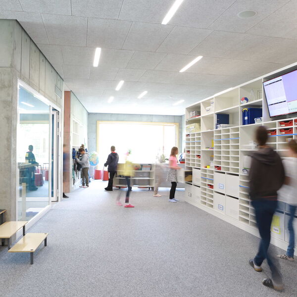 In ihrem Lernhaus im Neubau finden die Schülerinnen und Schüler der Klassenstufen 5 und 6 optimale Arbeitsbedingungen für die verschiedensten Unterrichtsphasen. In den Klassenräumen finden z.B. Inputs und Gruppenarbeiten im Klassenverband statt, in der offenen Lernlandschaft können berechtigte Schülerinnen und Schüler allein und in Kleingruppen z.B. in der IFA- Stunde arbeiten (siehe Graduierung). Die Arbeitsmaterialien der Hauptfächer sind in der offenen Lernlandschaft jederzeit zugänglich und können verwendet werden, auch wenn der entsprechende Fachlehrer gerade nicht anwesend ist. Vor dem Unterricht packen die Schülerinnen und Schüler das Material, das sie gerade brauchen, in ihre eigene Schublade, die sie an jeden Arbeitsplatz mitnehmen können. Somit bleiben die Schultaschen außerhalb des Klassenraums und sind nicht im Weg.