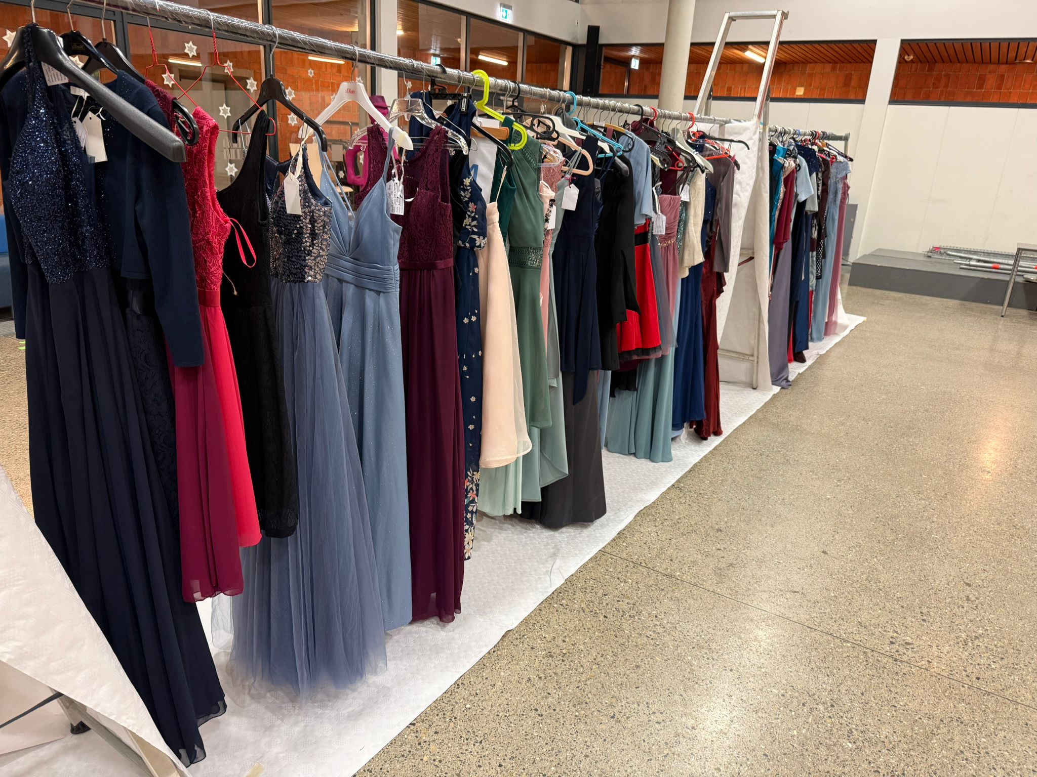 Bereits am Freitagabend fanden sich trotz schlechter Witterung zahlreiche Verkäufer in der Aula der Otl Aicher Realschule ein, um Kleider und Anzüge abzugeben. Ein fleißiges Team aus Eltern und Schüler sortierten diese nach Größen und präsentierten dann am Samstagmorgen eine große Auswahl an Kleidern und eine kleine, aber feine Auswahl an Anzügen.