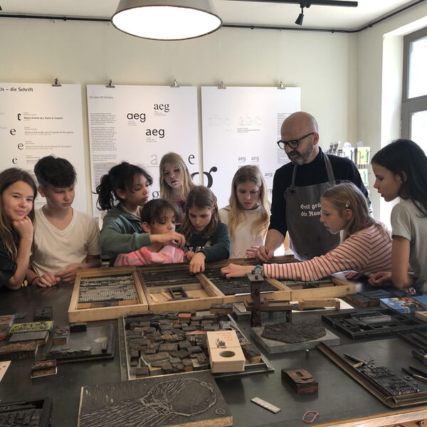 Nach ein paar einleitenden Worten zum Bockmuseum selbst – das Gebäude entstand z. B. anno 1520 in der Frühen Neuzeit - durften die HMG- Schülerinnen und -Schüler Herrn Hess in die Druck-Werkstatt begleiten. Dort erfuhren sie nicht nur, dass Johannes Gutenberg den Buchdruck (mit beweglichen Buchstaben) in der Mitte des 15. Jahrhunderts erfunden hat und dadurch eine Medienrevolution ausgelöst hat; die Schüler durften auch selbst mit den so genannten Blei-Lettern einen Türanhänger sowie viele Karten mit ihrem Namen bedrucken.