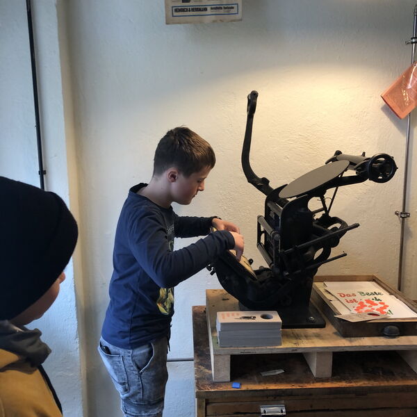 Nach ein paar einleitenden Worten zum Bockmuseum selbst – das Gebäude entstand z. B. anno 1520 in der Frühen Neuzeit - durften die HMG- Schülerinnen und -Schüler Herrn Hess in die Druck-Werkstatt begleiten. Dort erfuhren sie nicht nur, dass Johannes Gutenberg den Buchdruck (mit beweglichen Buchstaben) in der Mitte des 15. Jahrhunderts erfunden hat und dadurch eine Medienrevolution ausgelöst hat; die Schüler durften auch selbst mit den so genannten Blei-Lettern einen Türanhänger sowie viele Karten mit ihrem Namen bedrucken.