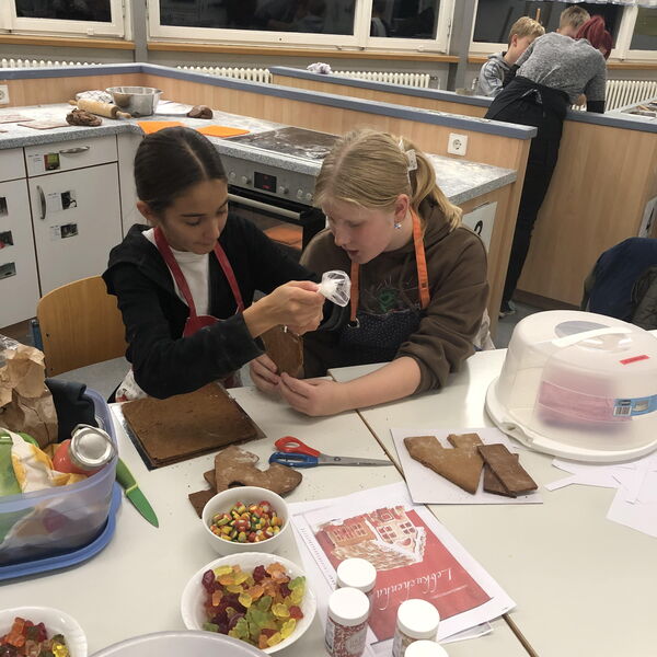 Vier Stunden lang konnten sich die HMG- Schüler von Frau Kristen in die Hänsel-und-Gretel-Welt bzw. ins Lebkuchenhausbacken entführen lassen. In vier Kleingruppen aufgeteilt, entstand für jeden Teilnehmer ein Häuschen, das natürlich auch mit allerlei Naschereien verziert werden durfte. Besonders schön mitanzusehen war, dass nicht nur die Kinder sich gegenseitig beim Häuschenbau unterstützten, sondern auch – gegen Ende des Workshops - die Eltern mit Geschwisterkindern tatkräftig und unaufgeregt mithalfen.